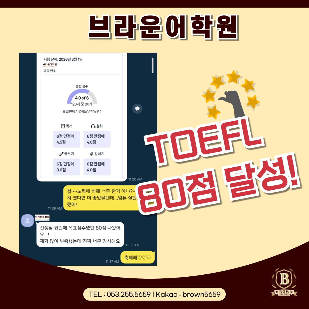 브라운어학원 대구점 수강생 TOEFL 80점 시험 목표 성공