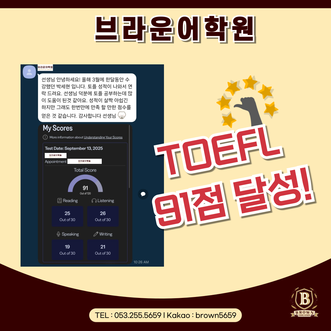 대구 브라운어학원 TOEFL 91점 달성 후기
