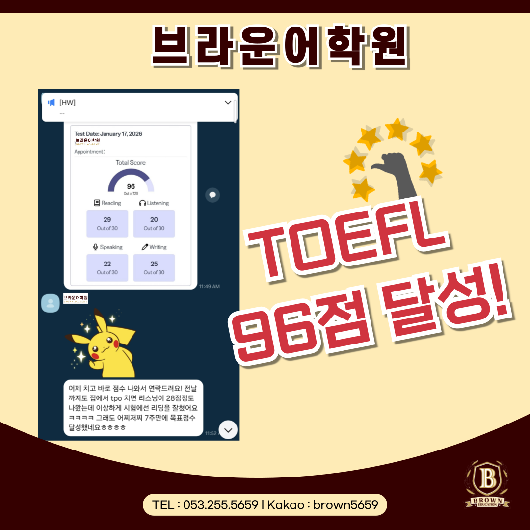 브라운어학원 대구점 수강생 TOEFL 96점 고득점 달성 후기