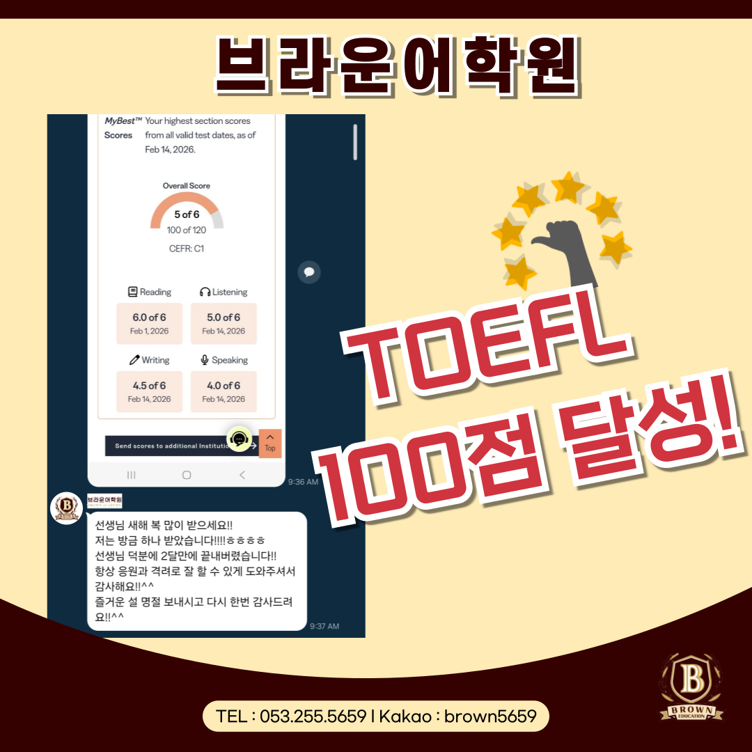 대구 토플학원 브라운어학원 TOEFL 100점 달성 사례