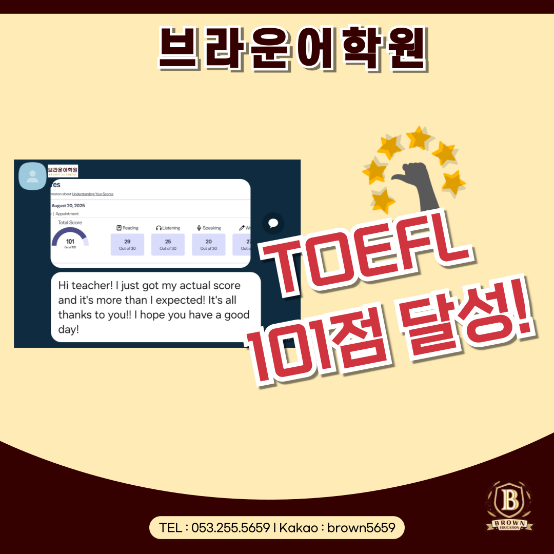 브라운어학원 대구 토플 수업 TOEFL 101점 달성